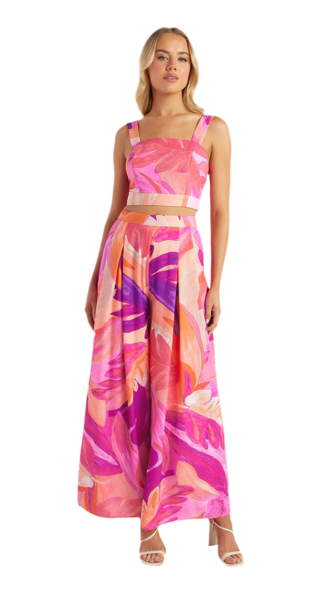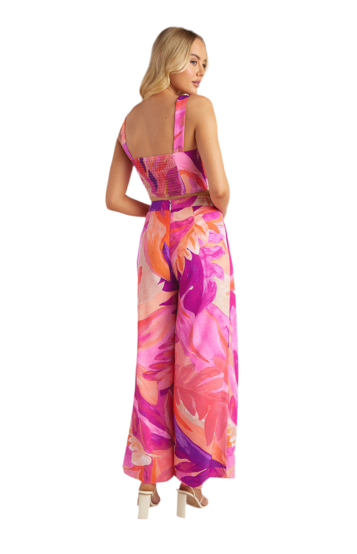 Luxurious Flamingo Sky Set features a lavish print on a two-piece pants set. The top has a square neckline with wide straps, boning at the bust for shaping, and a shirred center back bodice. The bottom is high-waisted with pleated details and a wide leg fit, all made from high-quality materials.