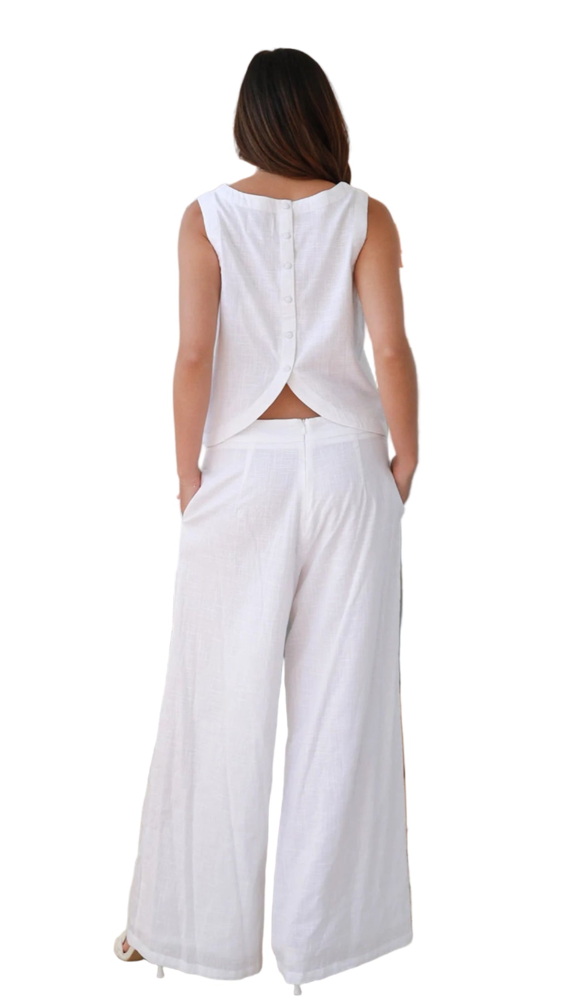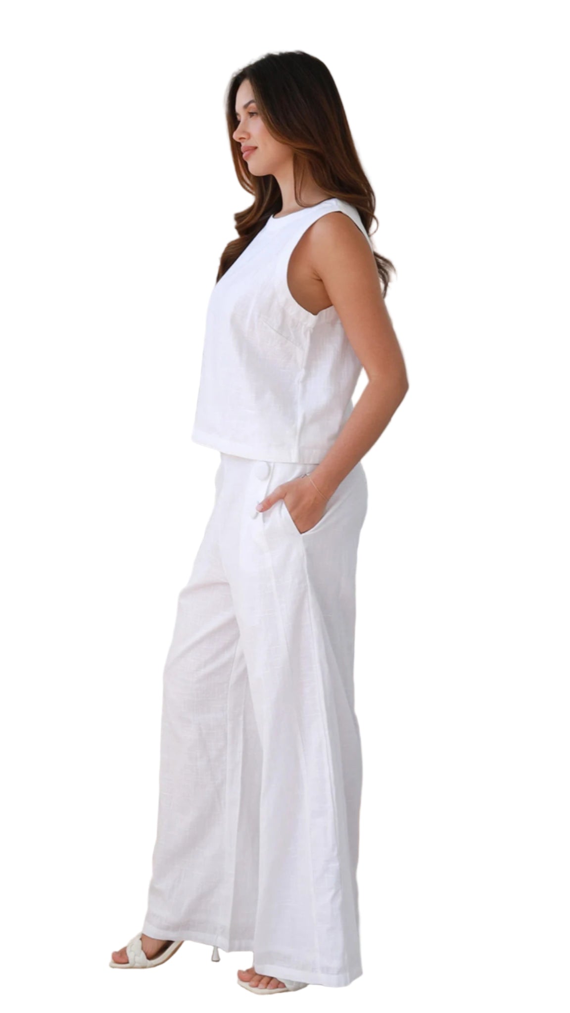 Designed for comfort and ease, this set features a relaxed-fit sleeveless top with a softly curved crossover back and coordinating wide-leg pants that move beautifully with every step.Â